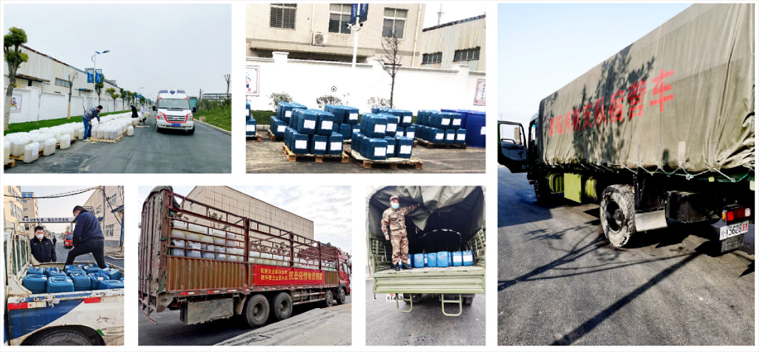 2020年年初新冠疫情全面爆發(fā),湖北又是全國的疫情中心。國難當頭,董事長帶領(lǐng)金達成部分領(lǐng)導(dǎo)主動請纓,勇?lián)厝危媾R種種困難,發(fā)揮黨員沖鋒在前、迎難而上的作風(fēng),生產(chǎn)84消毒液原液三百余噸,市值達四百萬,全部無償捐贈給疫情最需要的地方。
